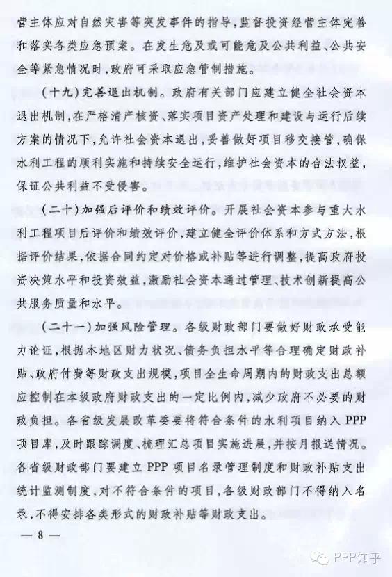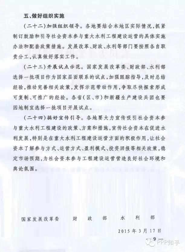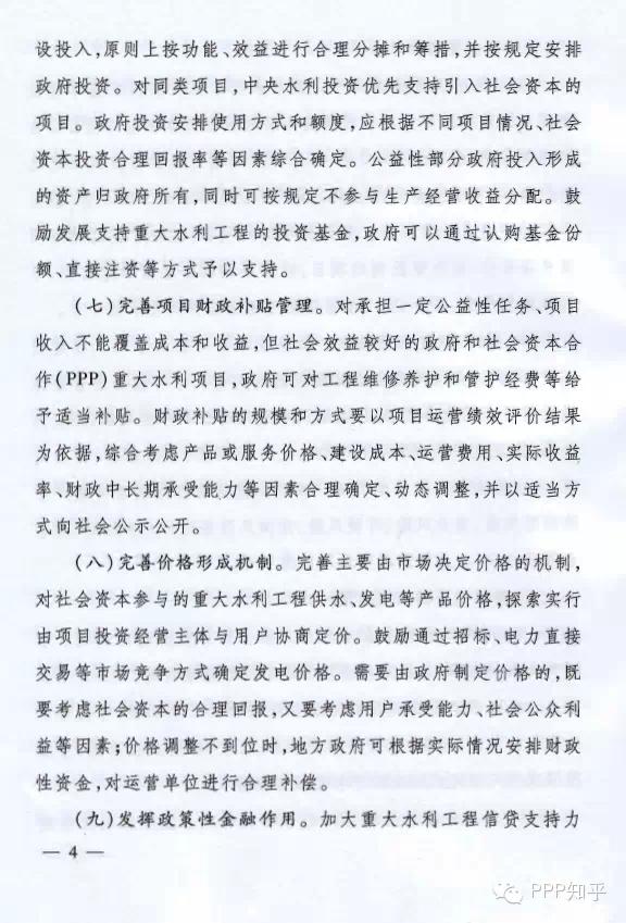 為貫徹落實黨的十八屆三中、四中全會精神和《國務(wù)關(guān)于創(chuàng)新重點領(lǐng)域投融資機制鼓勵社會投資的指導(dǎo)意見》(國發(fā)[2014]60號)有關(guān)要求,進一步拓寬水利投融資渠道,加快重大水利工程建設(shè),提高水利管理效率和服務(wù)水平,完善國家水安全保障體系,近日,國家發(fā)展改革委、財政部、水利部聯(lián)合出臺了《關(guān)于鼓勵和引導(dǎo)社會資本參與重大水利工程建設(shè)運營的實施意見》,通過政府投資引導(dǎo)、財政補貼、價格機制、金融支持等政策措施,鼓勵和引導(dǎo)社會資本投入?yún)⑴c重大水利工程建設(shè)運營,并將推出一批吸引社會資本參與的試點項目,探索政府與社會資本合作(PPP)的機制。